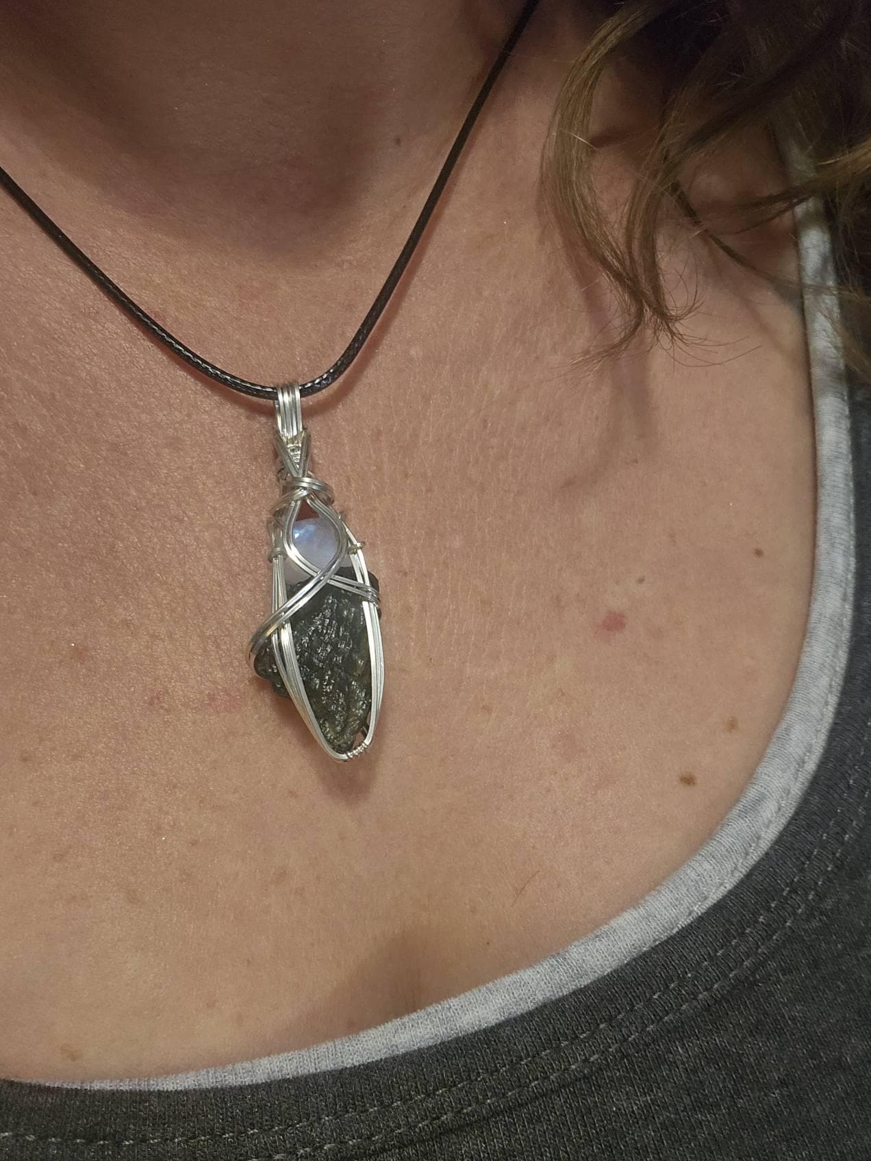 Genuine Moldavite Crystal with Rainbow Moonstone Necklace Pendant - Gold Czech Republic Tektite Healing Stones Jewelry with Black Leather Necklace