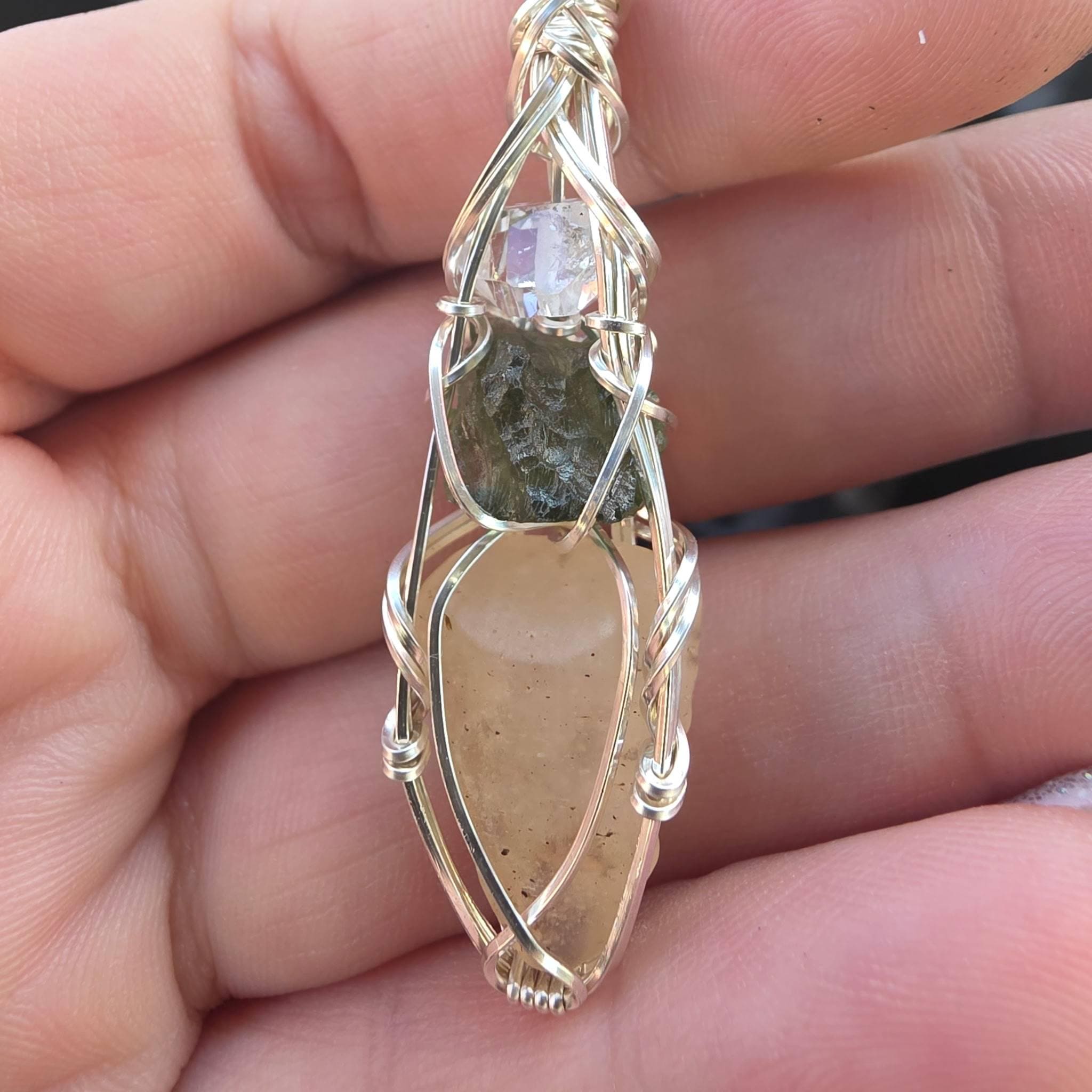 Genuine Moldavite with Libyan Desert Glass and Herkimer Diamond Pendant Necklace in Sterling Silver
