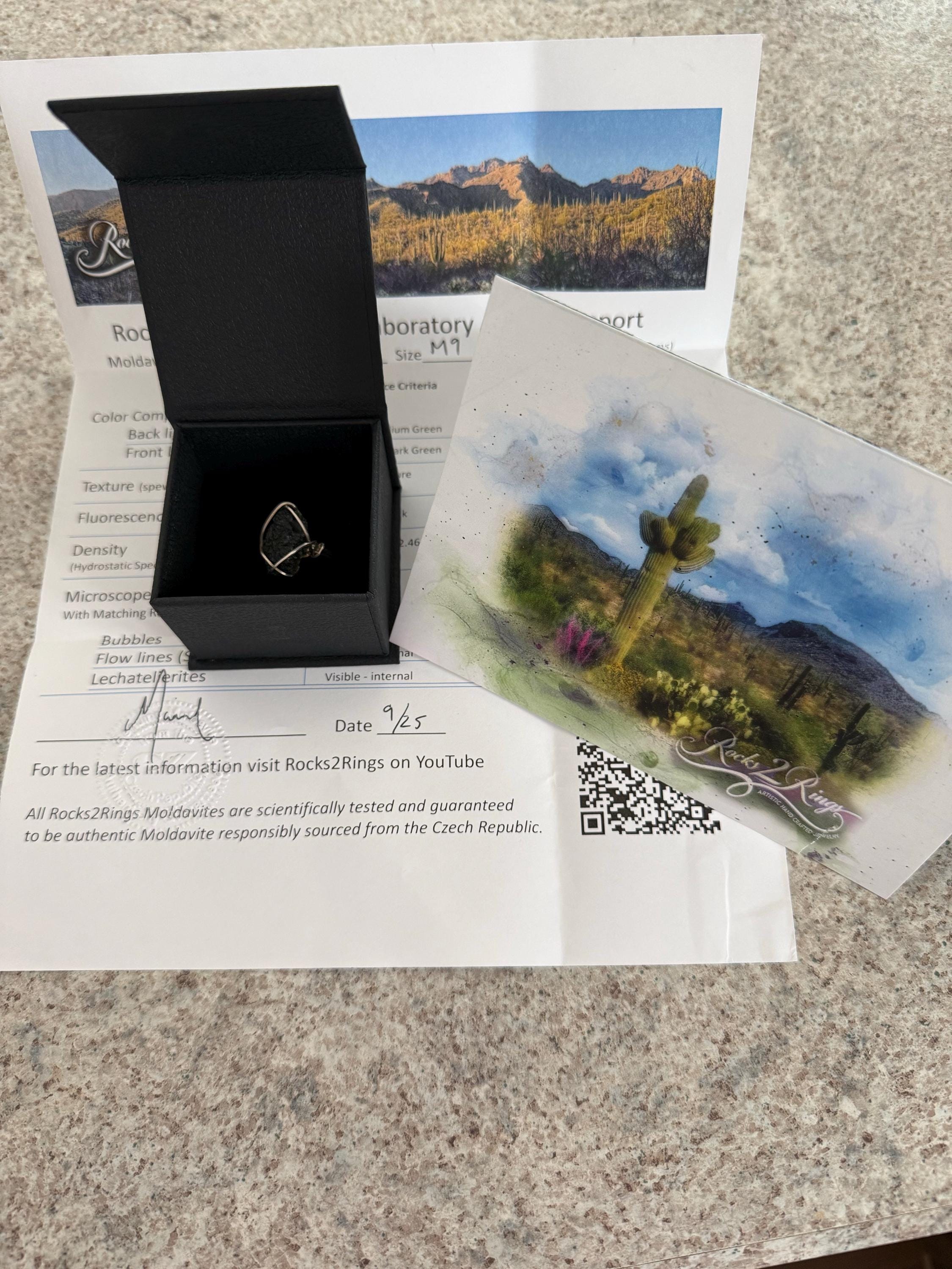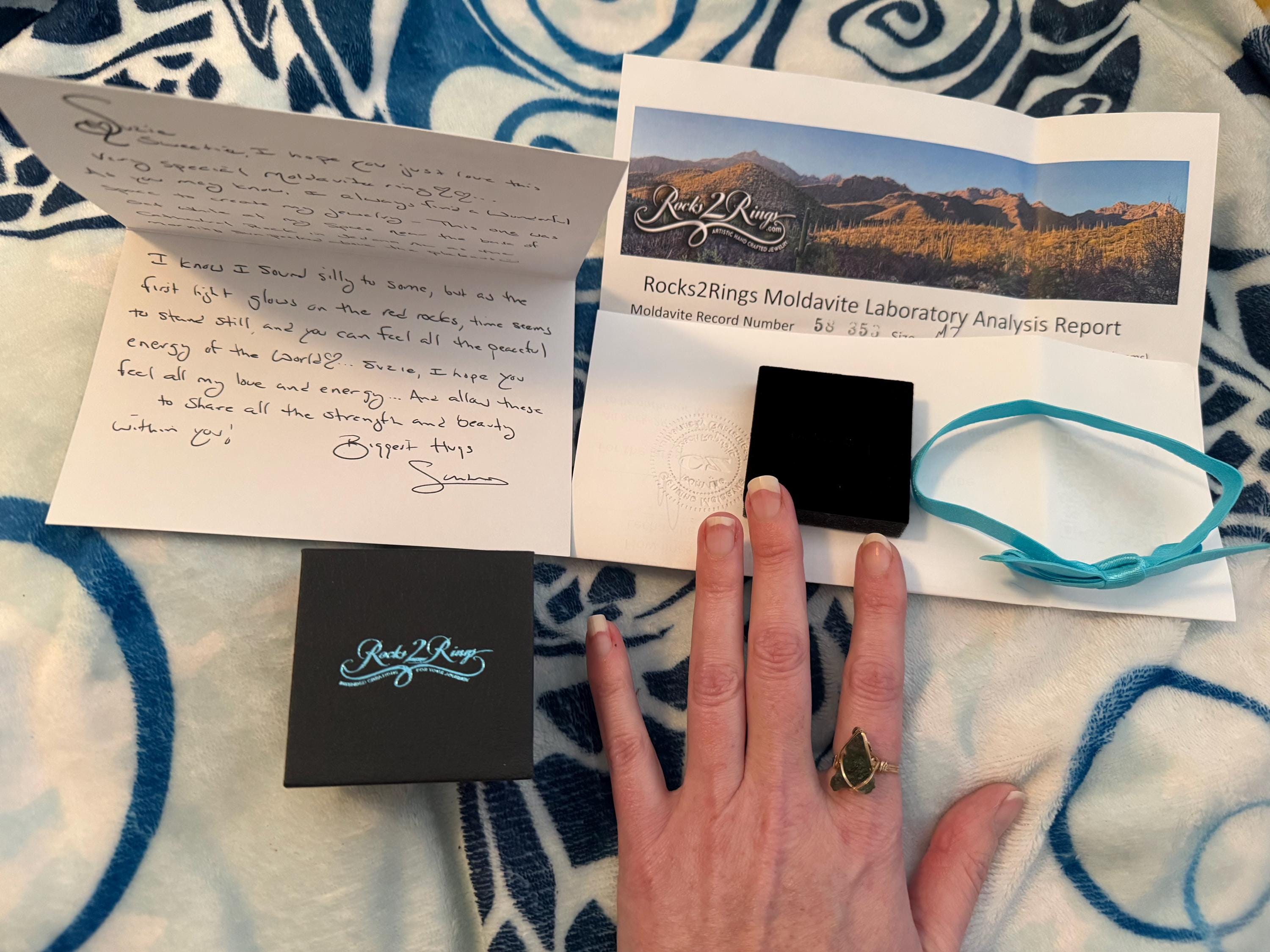I reached out because of concern I had over ppl selling fake moldavite. Sandra immediately responded to my concerns and reassured me. I felt much better after talking to her. She is extremely friendly & knowledgeable. I got my ring a couple days ago & have been testing it little by little. I get a little nauseous after having it on for just a short time so clearly it's pretty powerful. I knew I had have to take it slowly. It is such a beautiful ring. I got the one that reminds me of an arrow head & it fits perfectly. I love knowing I can reach out to her if I have an issue and she even will accept a return if there were an issue. The box is so pretty and the card was the absolute sweetest thing. I love personalized touches like that. Thank you 💛