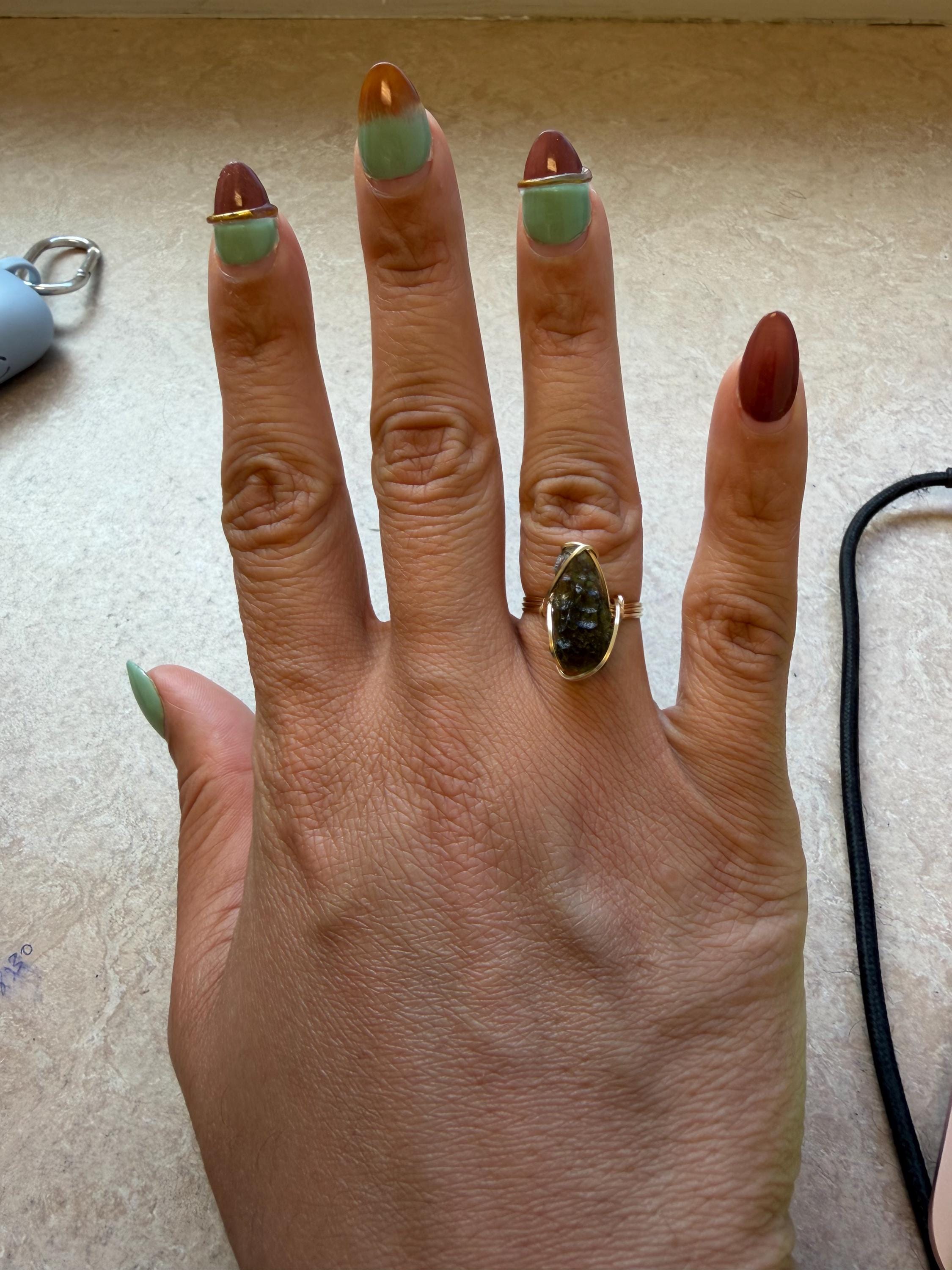 Charming and Delicate Moldavite Ring wrapped with 14k Gold Filled or Sterling Silver. Moldavite crystal rings are considered healing crystals, and our Moldavite crystal rings can be the perfect tool for manifestation and transformation. Our real moldavite rings come directly from the Czech Republic with certification.